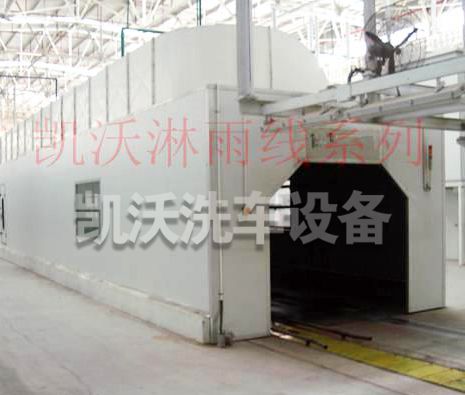 淋雨線的總體要求: 1、淋雨線的設(shè)計應(yīng)滿足QC/T 900-1997中關(guān)于淋雨試驗標準的要求。 2、淋雨段的噴淋長度保證L=16m,淋雨段的實體長度為18m;瀝干段和吹干段的長度為12m。 3、整車在淋雨與吹干間中的移動方式采用雙邊板式輸送機拖動。 4、設(shè)備為淋雨試驗與車身吹干一體式。 5、淋雨檢驗時,車身頂部的淋雨強度為15~19mm/min;車側(cè)面的淋雨強度為11~15mm/min。淋雨強度除滿足以上要求外,設(shè)備不需要底部噴淋功能。