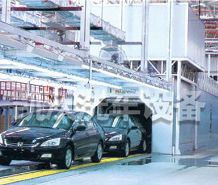 輸送線系統(tǒng)啟動(dòng),自動(dòng)將停靠在板鏈上的車輛送到入淋雨房進(jìn)行淋雨檢測(cè)。